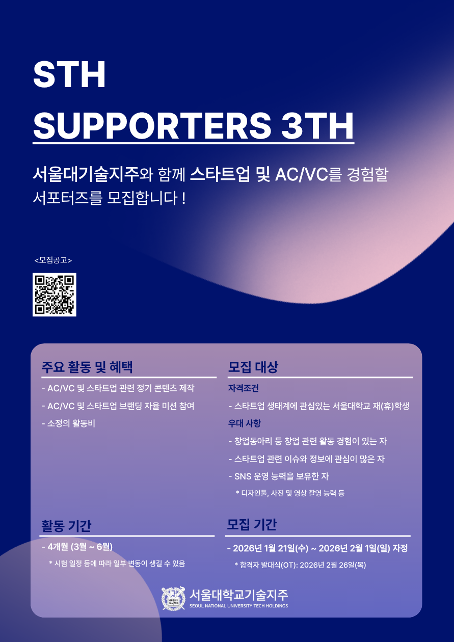 - 서울대기술지주 서포터즈 안내 페이지: https://snusth.notion.site/3-2ea9bba4ecfb80cdbcb2cbbb953ccba1?source=copy_link